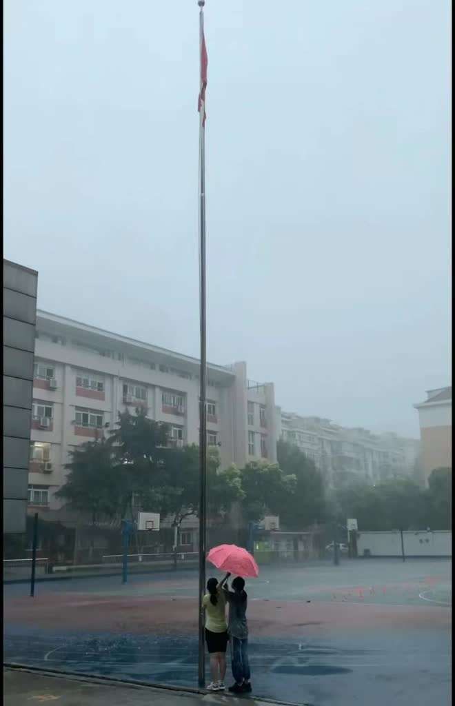 合肥寿春中学副校长陈立军告诉中青报·中青网记者,学校有南北两个操场,各有一根国旗杆。今天上午,暴雨突降,在南操场,两位正在进行暑期体育锻炼的八年级女同学李乐瑶、罗欣悦冒雨迅速收起了国旗。