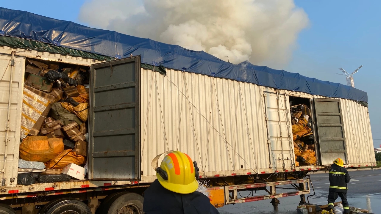 7月17日,大河网记者从河南省消防总队获悉,7月14日许昌长葛市长社路高速出入口处,一辆半挂快递车的车厢起火,车内还载有满满一车的货物,起火位置位于货车中部。