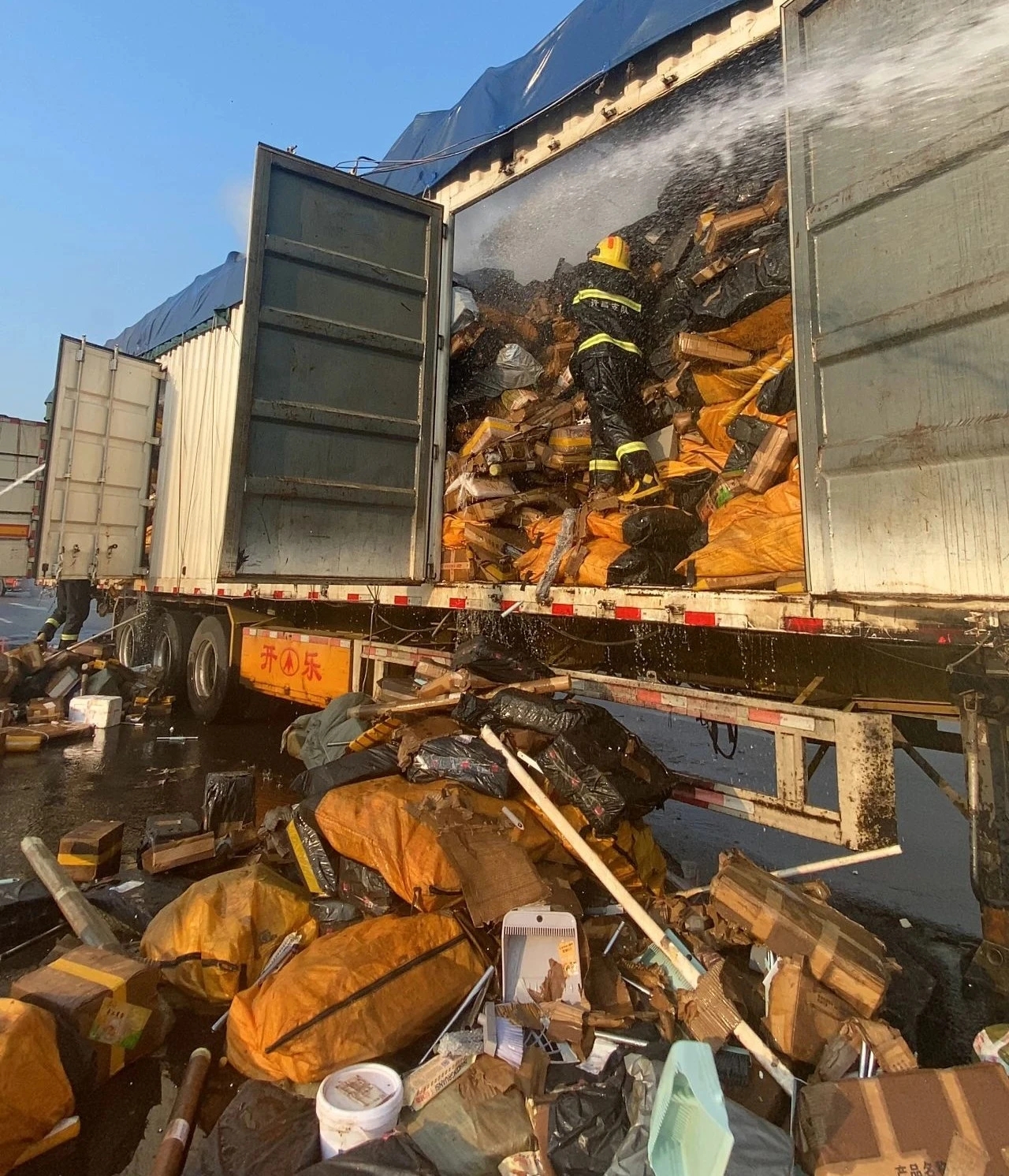 速看!你的快递可能被烧毁了 许昌一辆半挂快递车车厢起火