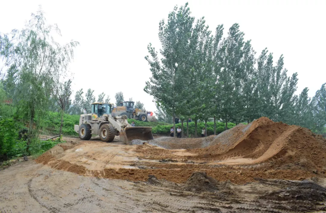 这片料场距离决口还有1.5公里。由于河堤路过于狭窄,决口附近难以承载大型车辆,货车只能将沙石卸在这里,待志愿者及救援官兵装好沙袋后背上河堤,再由农用三轮车装载送至决口。