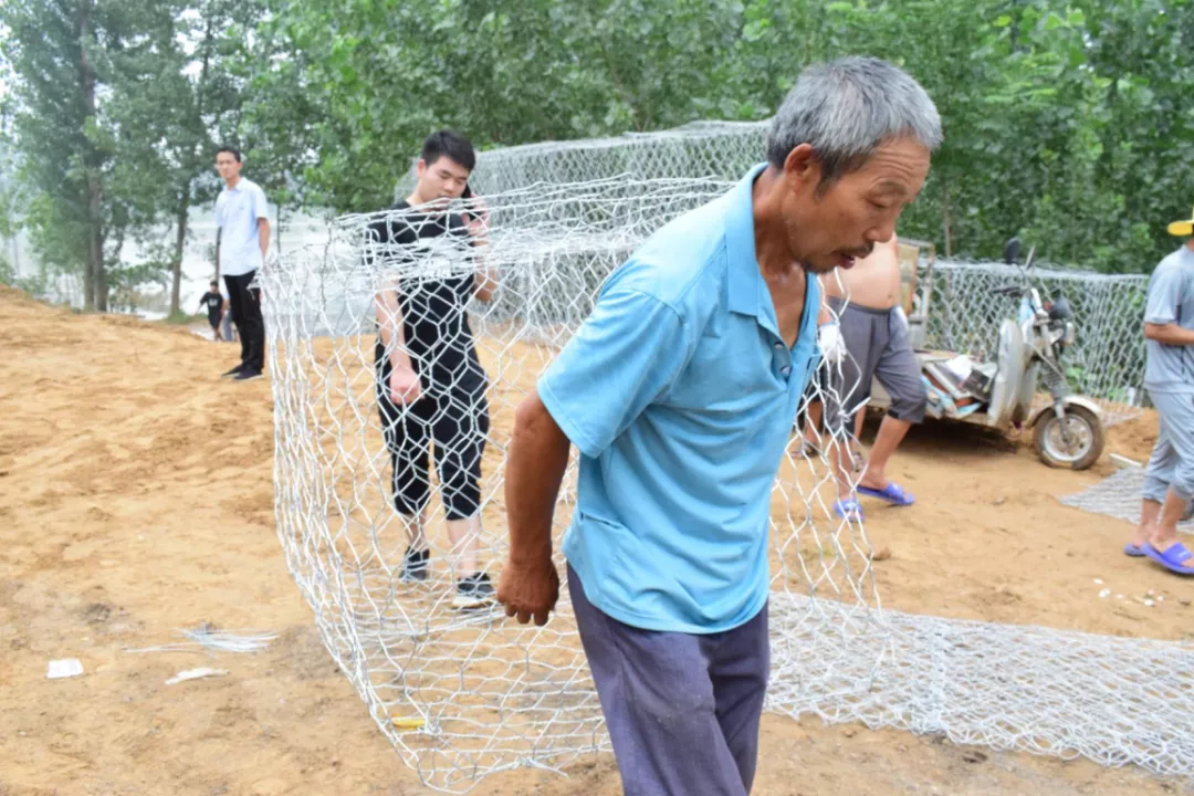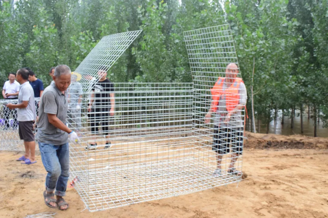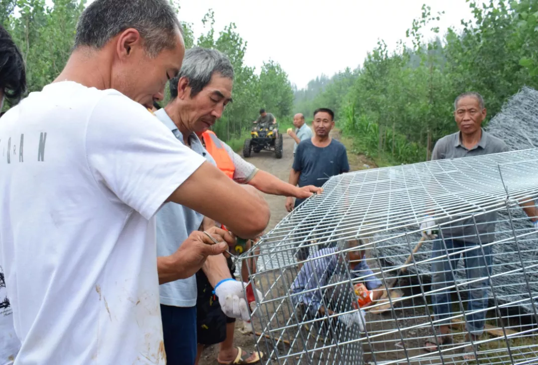 填入决口的沙袋太小容易冲散,此时便需要“格宾网”助阵!当天中午,笔者来到位于马武村附近的决口处,看到志愿者们正将不大的网格组成长一米、宽两米的方笼。