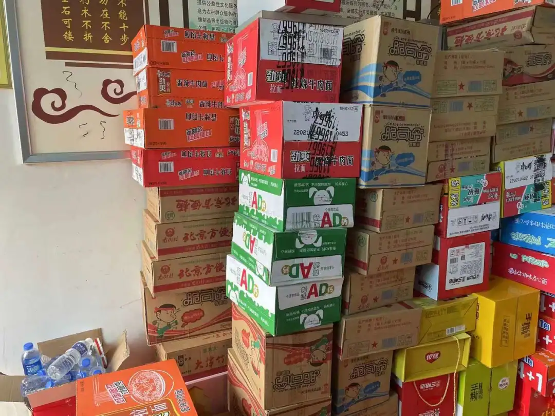 在马武村村委会,一箱箱矿泉水、方便面、面包、纸巾等物资摆满了半个村委大院。在一间不大的办公室里,爱心人士送来的物资已经摞至天花板高。