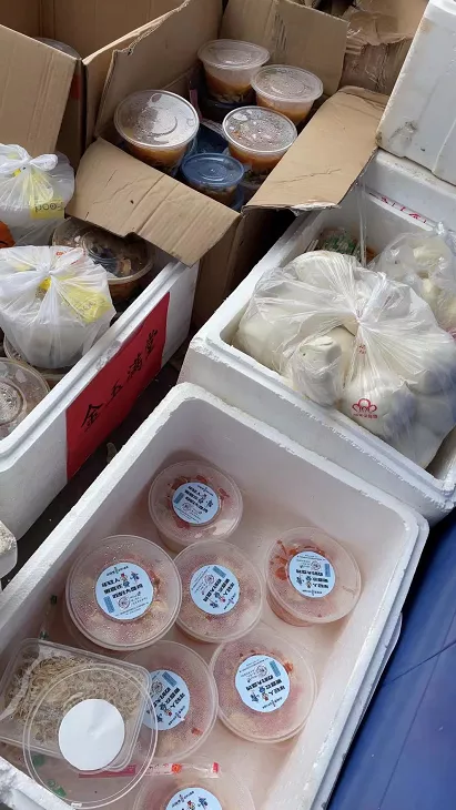 在这些爱心物资中,有馒头、面条、米饭等食品,也有湿巾、卫生纸等生活用品,但更多的是瓶装的矿泉水。