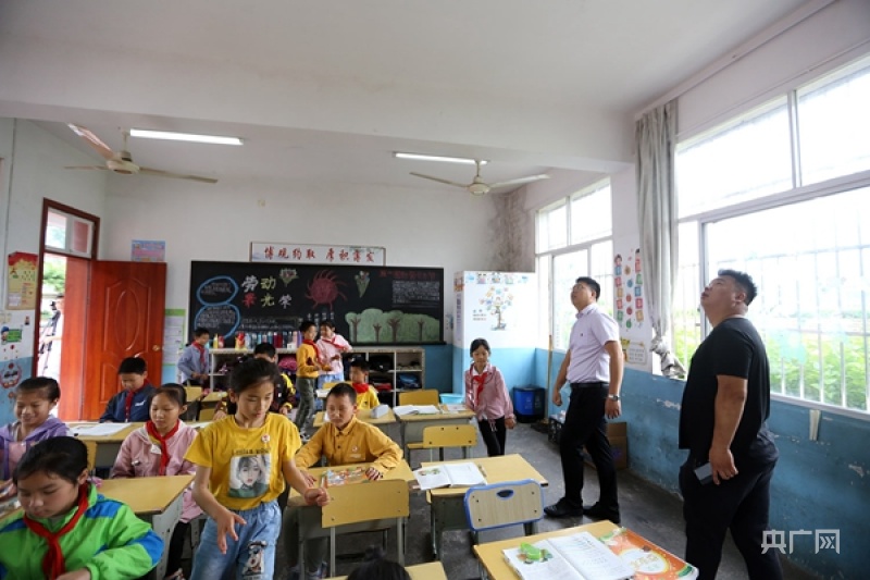 余旭和蒋有兵在淳安县如新希望小学检查教室灯光(央广网记者魏炜 摄)