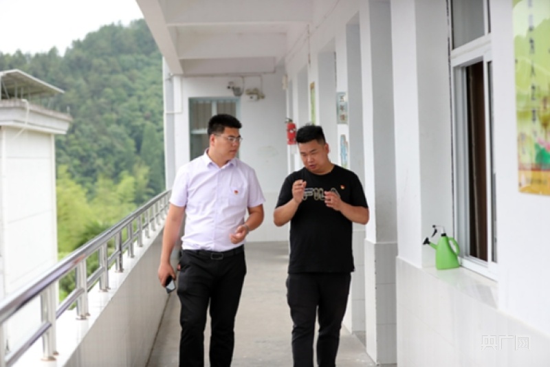 余旭和蒋有兵在淳安县浪川乡双源中心完小讨论教室灯光安装情况(央广网记者魏炜 摄)