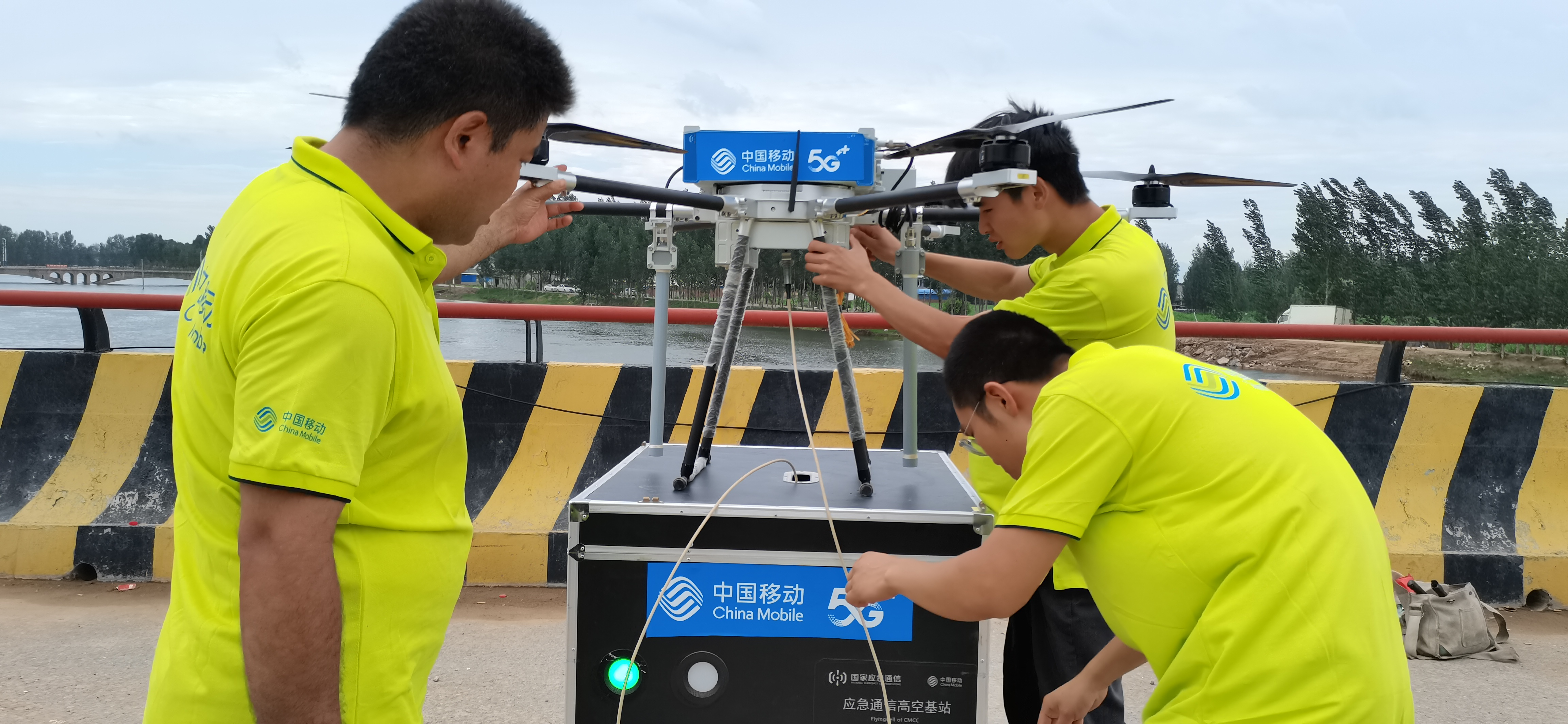 受特大暴雨灾害天气影响,鹤壁浚县新镇的网络设施受损。为进一步保障受灾严重地区的通信畅通,中国移动河南公司紧急调用“无人机高空基站”到新镇进行通信保障。在新镇桥上,移动工作人员快速娴熟的进行组装调测并做好相关准备工作,无人机高空基站顺利升空。