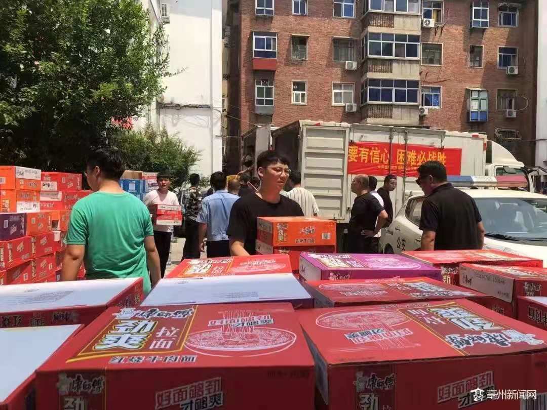 7月25日,谯城区互联网协会将募集到的矿泉水、方便面、火腿肠、养生花茶等物资送到了河南郑州,将这些物资捐赠到郑州市慈善总会指定接收单位郑州市交警三大队,然后由该大队民警将来自药都亳州的关怀,分发到灾区最需要的地方。