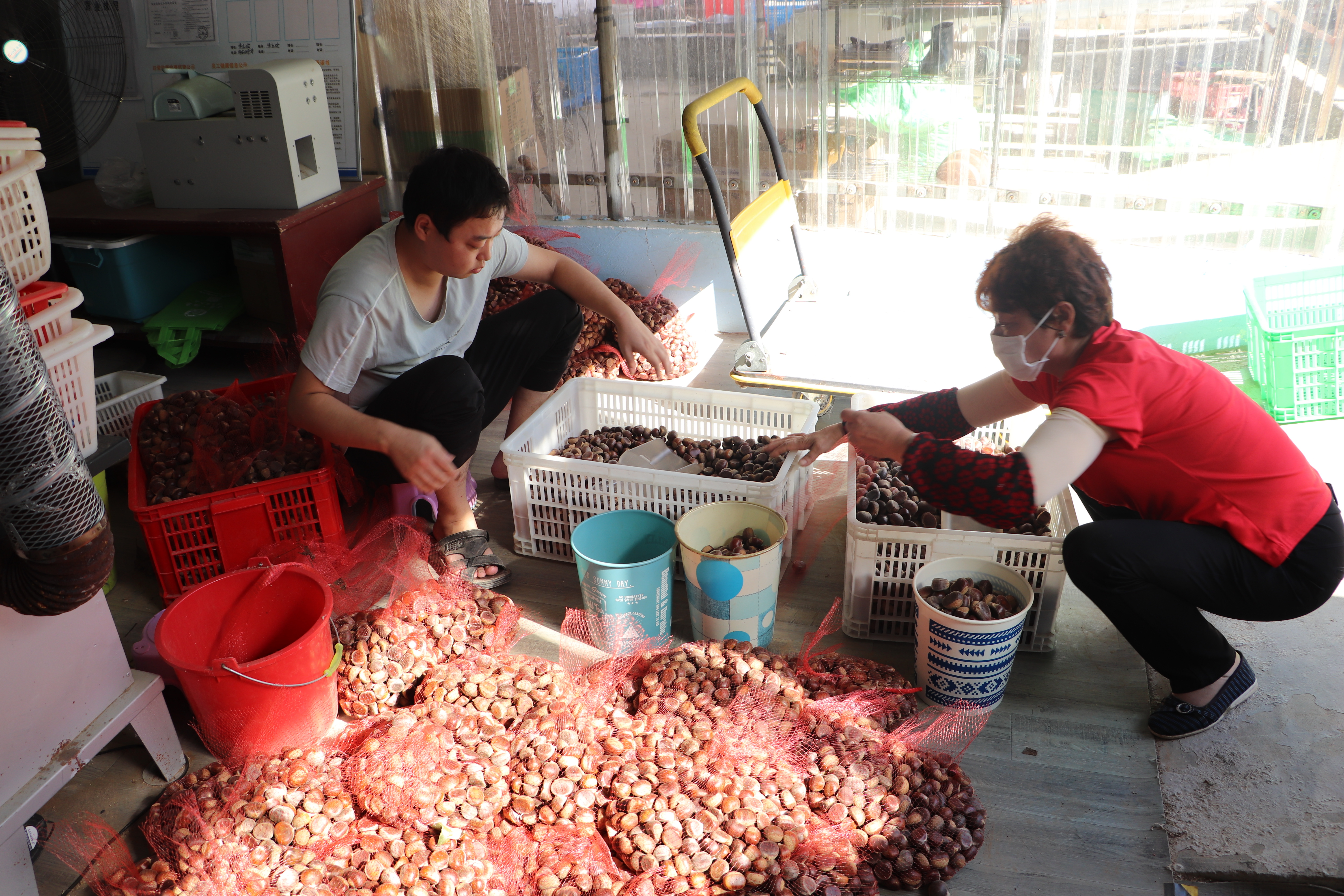 跟随朱立波的脚步,我们走进了板栗生产车间,只见工人们正在筛选不同品质、大小的油板栗,精心挑选、剔除虫眼,确保每颗板栗都是优质原果。