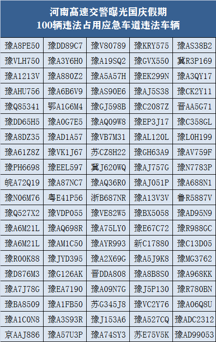 大河网讯 (记者 宋向乐)10月9日,大河网记者从河南省高速交警总队获悉,在刚刚过去的国庆假期,河南高速交警接到群众举报违法占用应急车道车辆9500余台次。