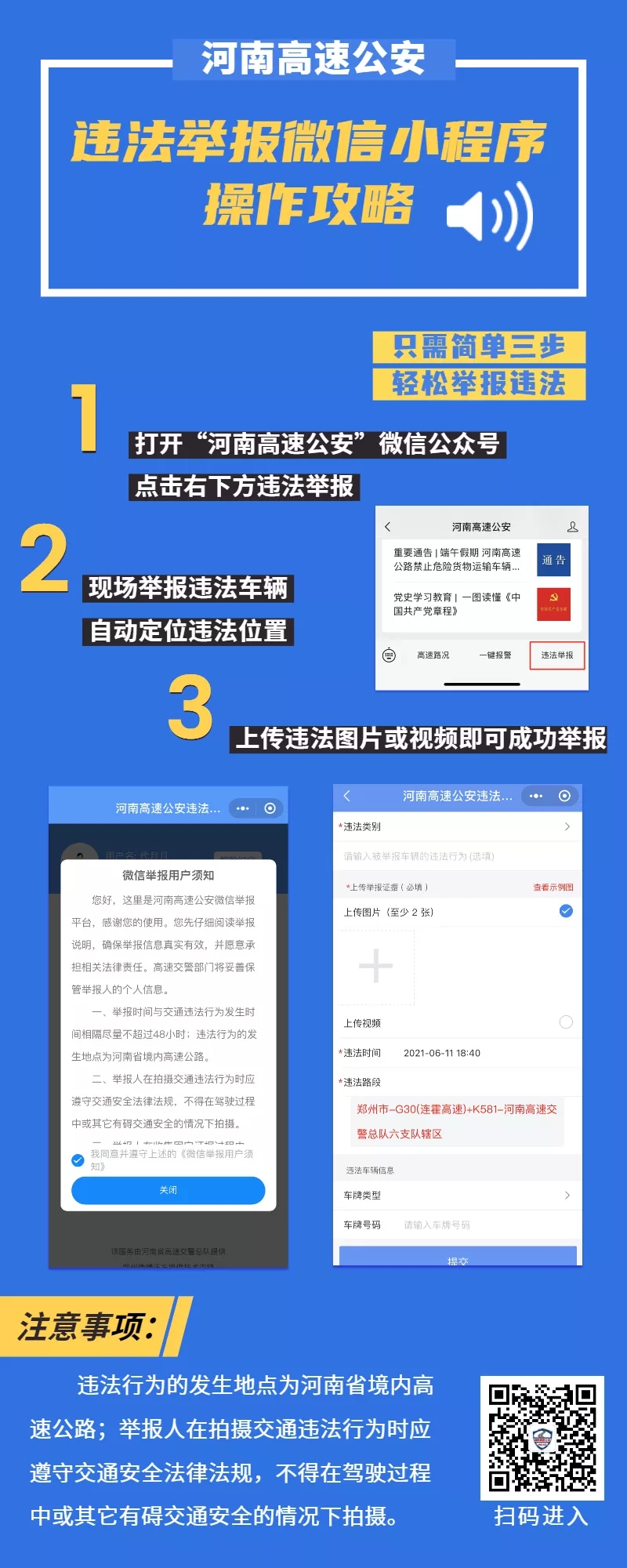 据悉,市民在省内高速公路上发现有违法占用应急车道等违法车辆的,可以通过“河南高速公安违法举报”微信小程序举报违法车辆,自动定位违法地点,举报更方便、快捷、有效,警民携手,共同守护全省高速公路通行更安全、有序、畅通。
