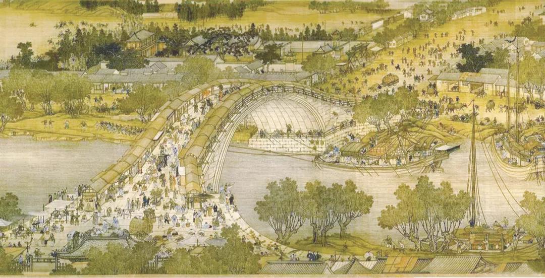 《清明上河图》被称为北宋社会的“百科全图”,作为中国绘画史上最著名的作品之一,但凡有些书画及历史知识的人都不会陌生。打开长卷,首先扑入眼帘的是茂盛的树林,整齐的农田,散落的房屋,蜿蜒的河流,一列队伍在郊外缓缓而行,几只庞大的航船在纤夫的引拉下,向河岸靠近,一幅恬静悠闲的乡村景象。向城中进发的人们,有的赶着牲畜,有的带着货物,有的扛着行李。再往前走,气势恢宏的虹桥上人头攒动,一只巨大的货船正在过桥,不少人在驻足观看,还有人在喊叫着什么。穿城而过的汴河里船来船往,络绎不绝,或纤夫牵拉,或船工摇橹,有的满载货物,逆流而上,有的靠岸停泊,忙碌卸货。转眼间,高大的城门出现,纵横的街道四面延伸,两边的屋宇鳞次栉比,一派令人眼花缭乱的繁华景象。摩肩接踵的行人,有在路边交易的,有在茶馆休息的,有在叫卖邀客的,有在看相算命的,有在匆匆赶路的,还有骑马的官吏,叫卖的小贩,乘坐轿子的富家眷属,身负背篓的行脚僧人,打打闹闹的顽皮儿童。有人细心数了数,这幅长约5.28米的画中有牲畜83匹,船只29艘,房屋楼宇30多栋,车13辆,轿8顶,桥17座,树木180余棵。尤其是画中的814个人物,男男女女,老老少少,衣着不同,神情各异,惟妙惟肖,栩栩如生。这熙熙攘攘的人流和舟车生动地反映了当时汴京城内商品经济兴旺、交通运输繁忙、城乡关系密切、南北货物畅通的情景,再现了九百多年前我国都城社会经济生活各个方面的实况,可谓一幅活灵活现、有情有味的汴京民俗风情图。