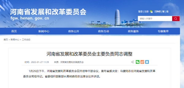 马健任河南省发改委党组书记 2022-01-27正观新闻 1月26日下午,河南省发展和改革委员会召开领导干部会议,宣布省委决定:马健同志任河南省发展和改革委员会党组书记。省委组织部副部长高树森同志出席会议并讲话。 编辑:王晓颖