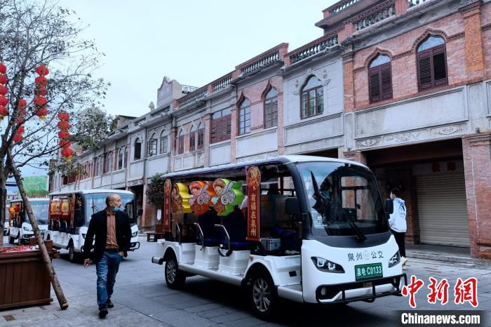 在泉州古城区,装扮一新的各主干道两旁行道树悬挂着红灯笼,百年中山路每隔几米就挂上各式各样的花灯,一眼望不到头的红色将古城街道装扮得格外喜庆。而穿行在古城古巷之间的“小白”观光小巴士,换上了流光溢彩的“新衣”,成为一道独特的风景线。