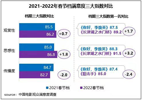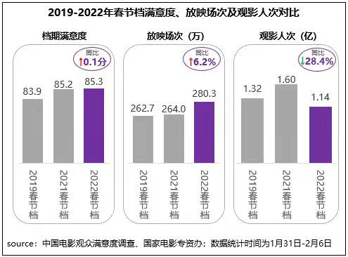 中国网2月8日讯 中国电影资料馆日前发布的中国电影观众满意度调查 2022年春节档调查结果显示,春节档观众满意度得分85.3分,同比增长0.1分,为2015年开始调查以来同档期最高分。