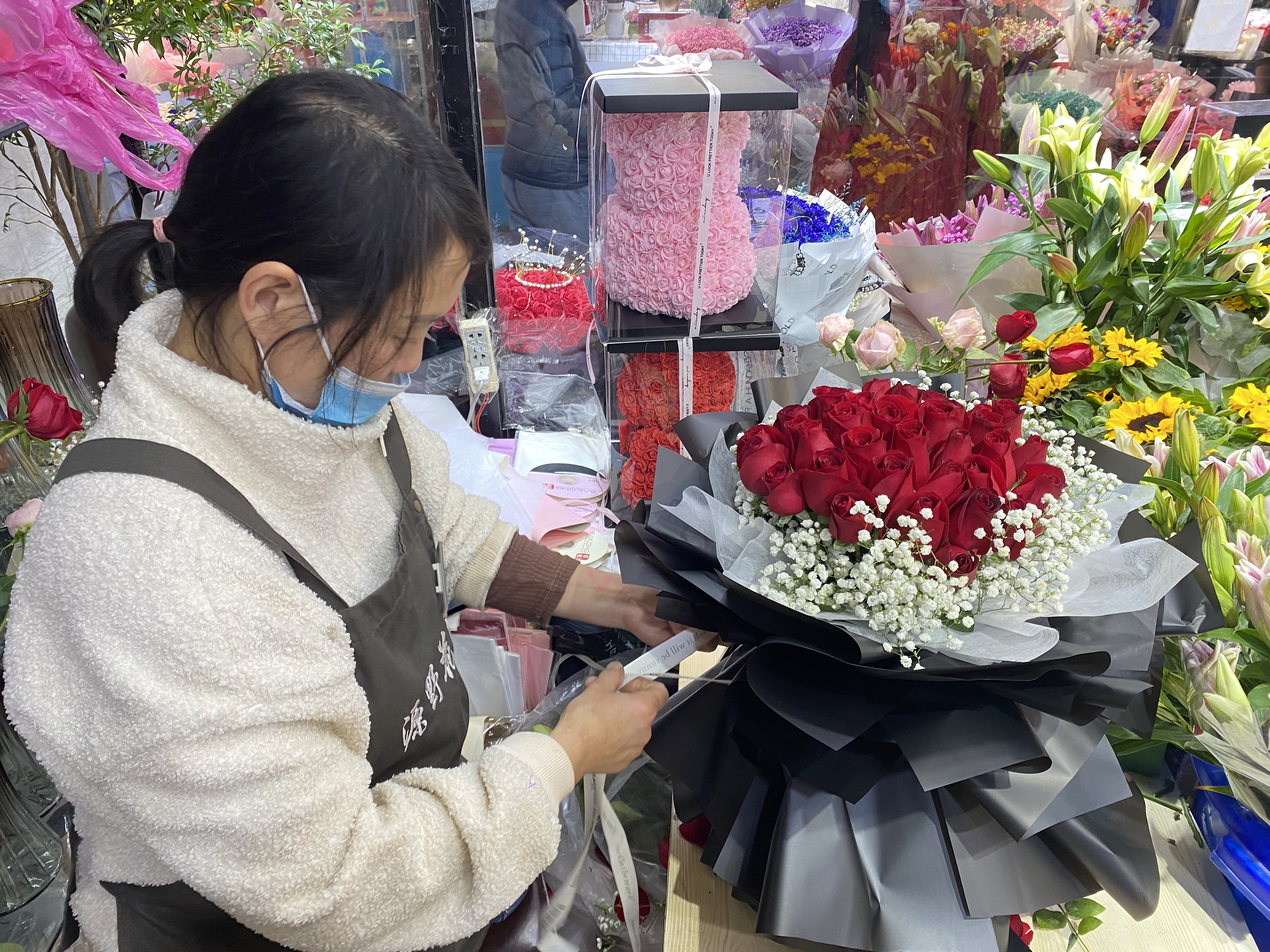 在一家花店门店,张先生正在犹豫是要红玫瑰还是香槟玫瑰。他告诉记者,今年是第一次给女朋友送花,因为女朋友平时喜欢比较淡雅的颜色,所以拿不准是送红玫瑰还是其他颜色的玫瑰。最终在商家的推荐下,他选择了以红玫瑰为主,粉色洋牡丹和绣球花搭配的花束。