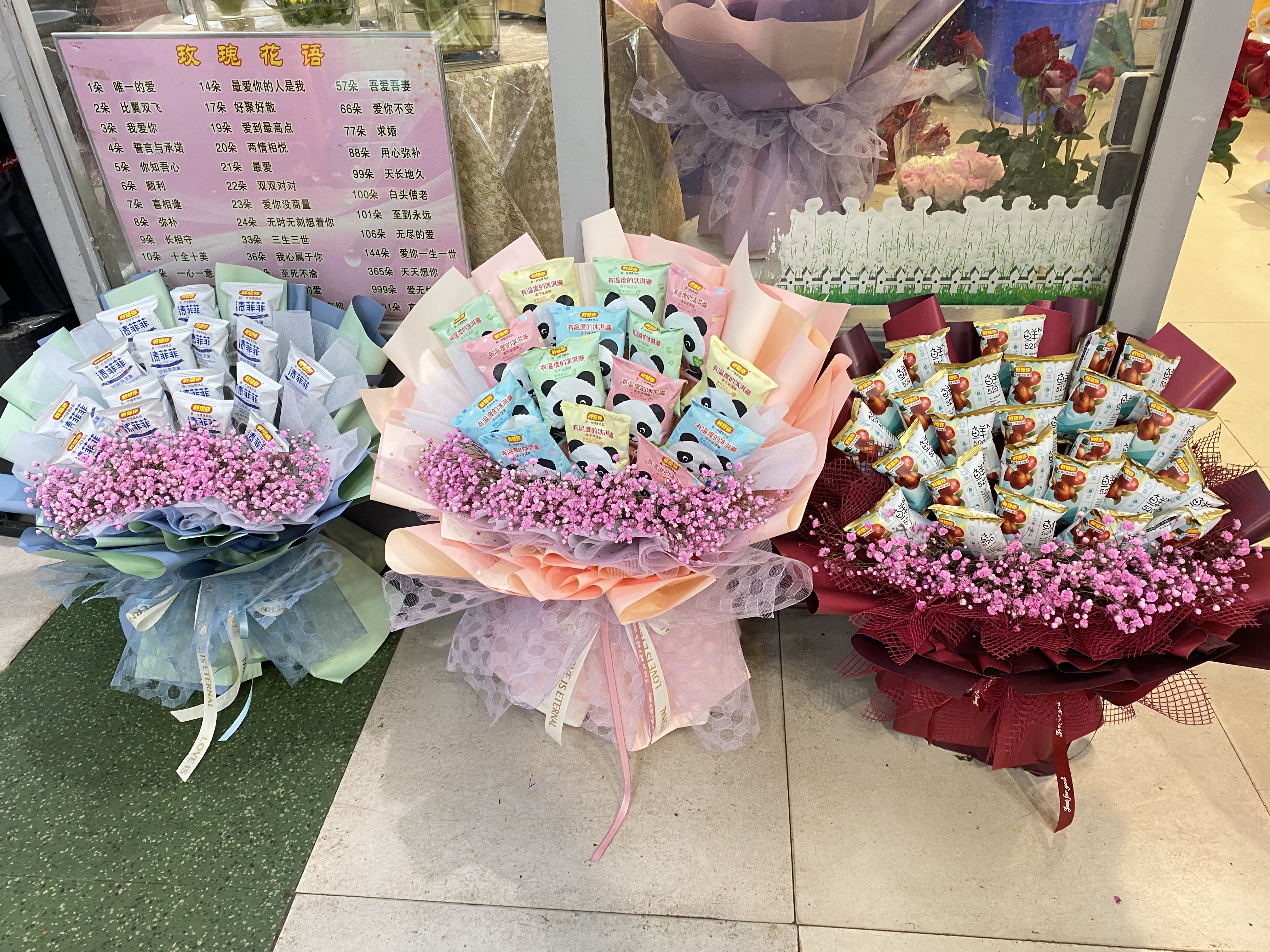 在旁边的一家花店,记者还看到了一捆绑满了大白兔奶糖的花束。此外,还有棒棒糖花束、玩具小熊的花束等等。