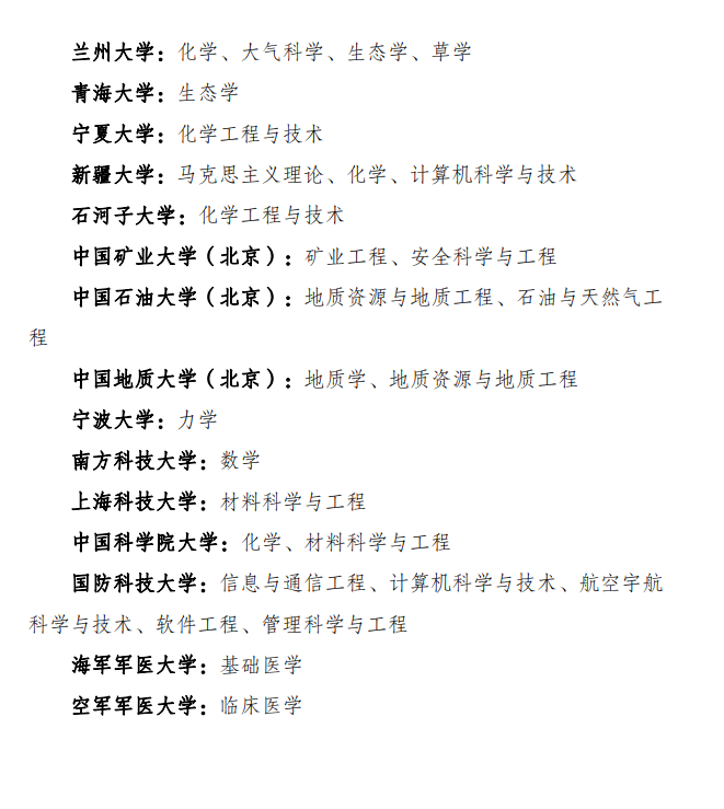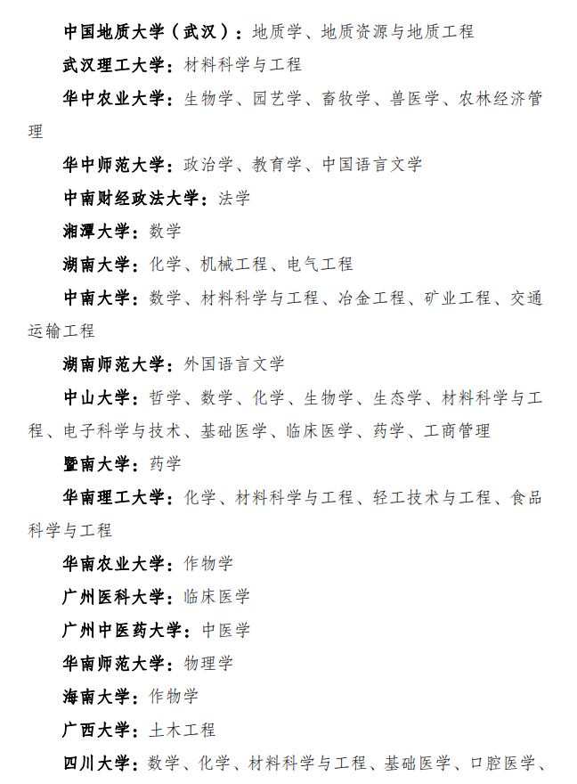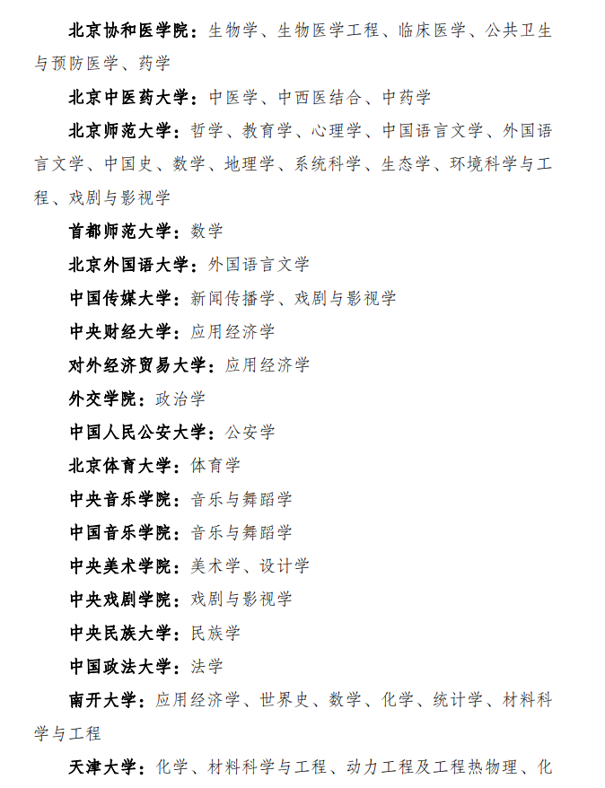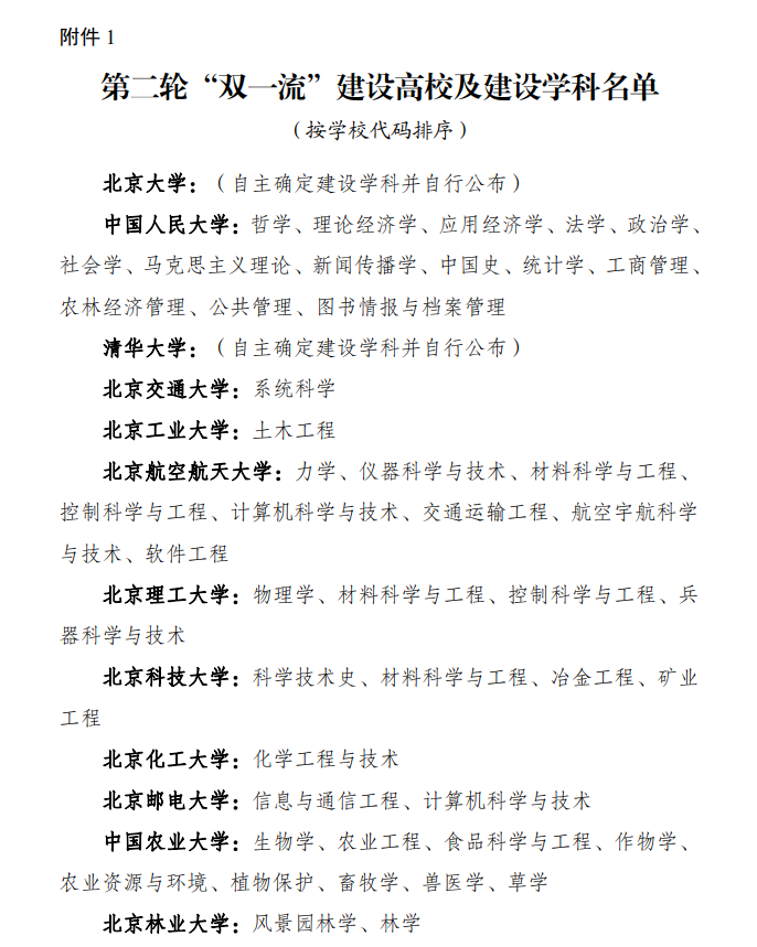 根据国务院《统筹推进世界一流大学和一流学科建设总体方案》,以及教育部、财政部、国家发展改革委《关于深入推进世界一流大学和一流学科建设的若干意见》和《统筹推进世界一流大学和一流学科建设实施办法(暂行)》,经专家委员会认定,教育部等三部委研究并报国务院批准,现公布第二轮“双一流”建设高校及建设学科名单(见附件1)和给予公开警示(含撤销)的首轮建设学科名单(见附件2)。