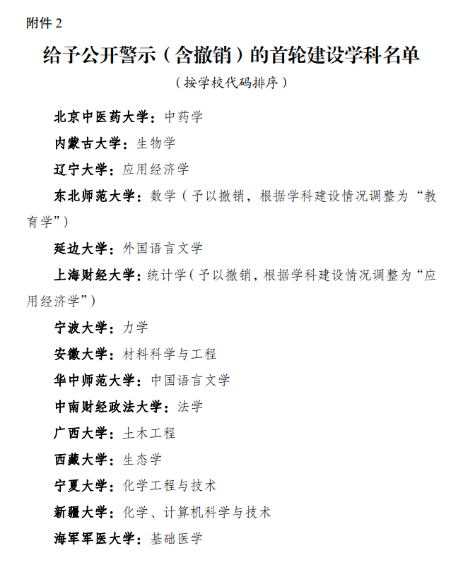 2. 给予公开警示(含撤销)的首轮建设学科名单