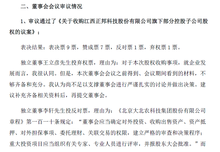 据大北农公告,公司董事会在2月27日召开会议,审议通过了关于收购正邦科技旗下部分控股子公司股权的议案。虽然议案最终获得董事会审议通过,但事实上,董事们的意见并不统一。其中,独立董事王立彦投出弃权票,独立董事李轩投出了反对票。