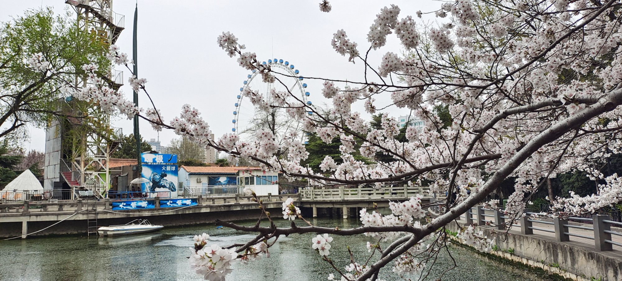 17日,记者在郑州市人民公园看到,嫩黄的迎春、繁盛的樱花、娇艳的玉兰在寒风中顽强地开放,散发着幽香,落花随风拂水,湖面泛起涟漪。