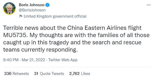 中新网3月21日电 当地时间21日,英国首相约翰逊在社交媒体发文表示,他得知了中国东方航空公司MU5735航班发生事故的消息,并表示他的心与所有陷入这场悲剧的人的家人同在,和正在执行任务的救援人员同在。