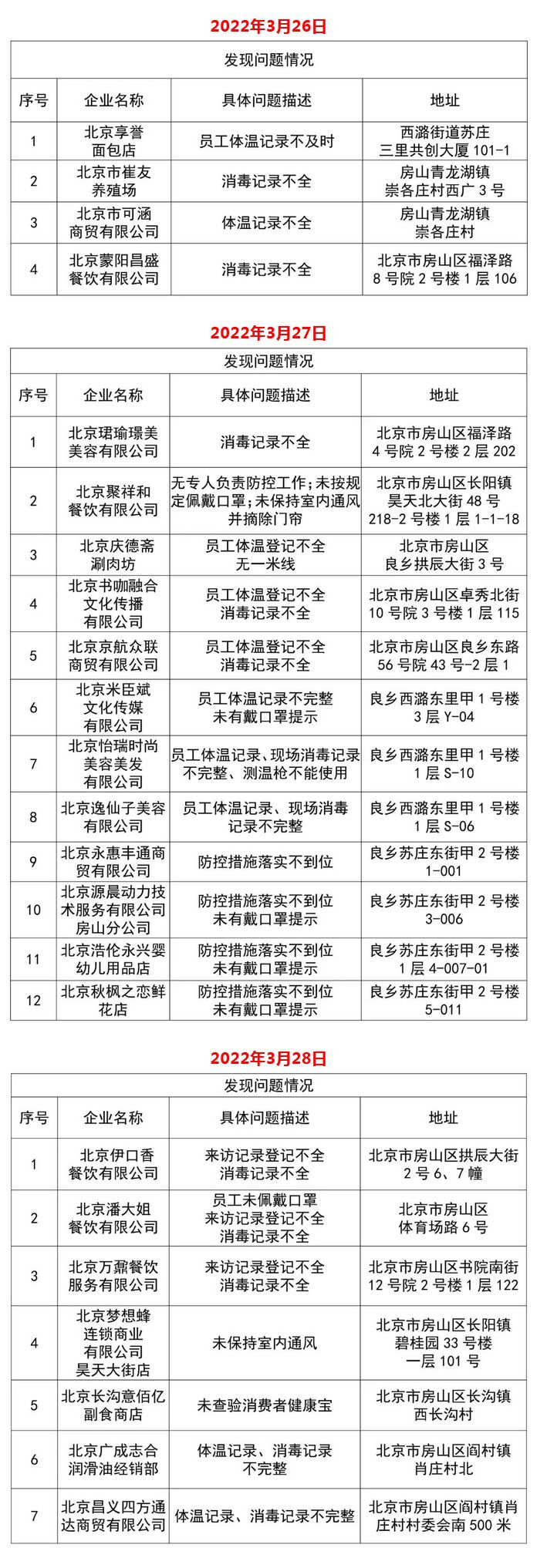 据北京市房山区市场监督管理局微信号消息,北京市房山区市场监督管理局3月28日通报23家“五类之外”市场主体存在疫情防控措施落实不到位的问题,主要包括:未建立员工体温记录台账(未及时记录)、未建立场所消杀记录台账(未及时记录)、员工未佩戴口罩、场所内无一米线、未对消费者体温检测、未查验消费者健康宝等问题。