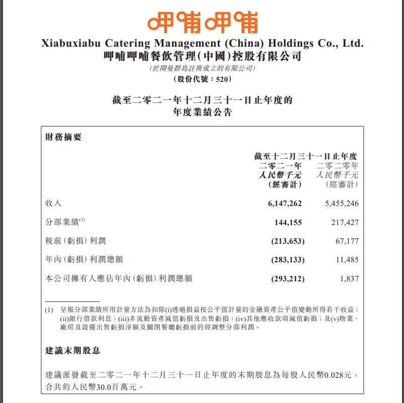【大河报·大河财立方】(记者 吴海舒 实习生 焦婉滢)3月28日,呷哺呷哺发布2021年年报。年报显示,2021年呷哺呷哺共实现营业收入61.47亿元,同比增长12.7%。由于疫情和关闭亏损门店的一次性不利影响,呷哺呷哺经历了2014年上市以来首次年度亏损,亏损额2.13亿元。