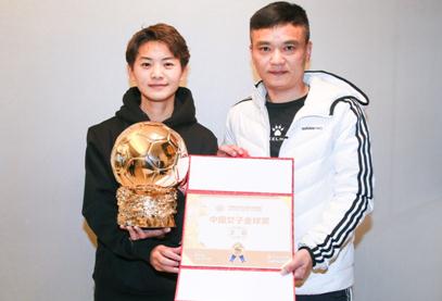 王霜从她青少年时期的教练、武汉东西湖区足球青训教练的韩建手中接过中国女子金球奖奖杯。中国金球奖组委会供图