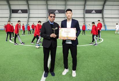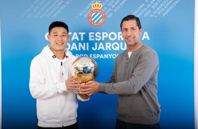 西班牙人足球俱乐部新闻发言人卡普德维拉为武磊颁发中国金球奖。中国金球奖组委会供图。