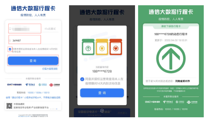 第四步:首次验证时,跳转至“通信大数据行程卡”界面,输入手机号获取验证码,同意授权,点击“查询”后显示动态行程卡,请向工作人员出示绿码。(首次手机号验证后,后续点击“查看行程卡”仅需同意授权即可)