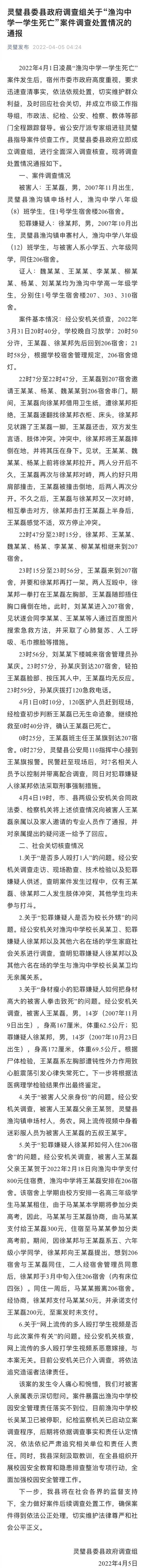 据“灵璧发布”消息,4月5日,安徽灵璧县委县政府调查组发布关于“渔沟中学一学生死亡”案件调查处置情况的通报。