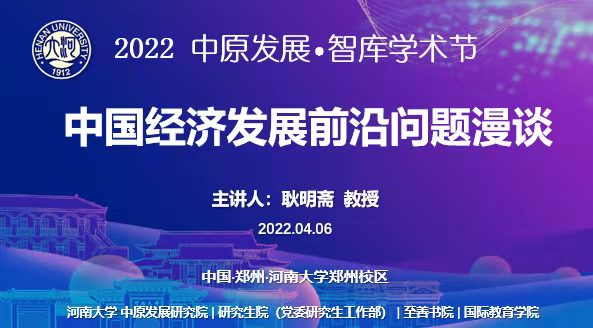 大河网讯 2022年4月6日下午,“中原发展•智库学术节”活动在河南大学郑州校区友兰学堂启动。第一场讲座由河南省政府专家咨询委员会委员、中原经济发展研究院院长耿明斋主讲中国经济发展问题漫谈。会议采取线上线下结合的方式,河南大学几百名师生参加了学术节活动。