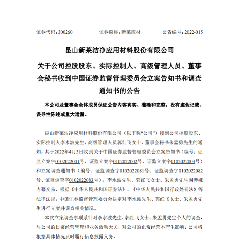 【大河报·大河财立方】(记者 陈诗昂)4月5日晚,“三倍牛股”昆山新莱洁净应用材料股份有限公司(新莱应材,300260.SZ)公告称,接到公司控股股东、实控人李水波,高管郭红飞,董秘朱孟勇的通知,三人因涉嫌内幕交易被中国证监会立案。