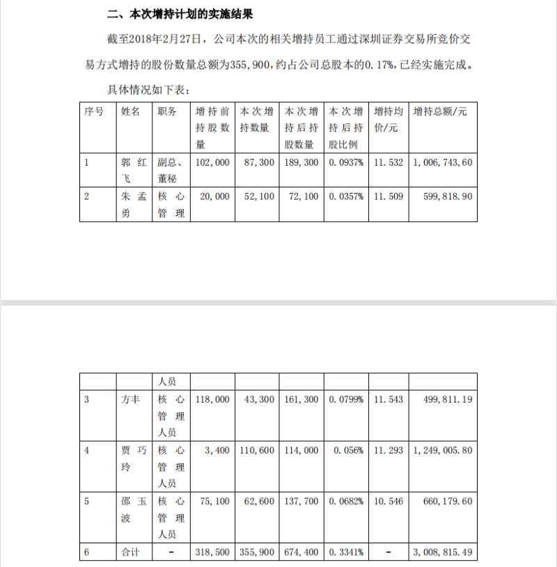 2月27日,新莱应材发布公告称前述增持股份计划完成,相关增持员工(副总、董秘,及4名核心管理人员,共5人)通过深交所竞价交易方式增持355900股,约占公司总股本的0.17%,增持总额约300万元。