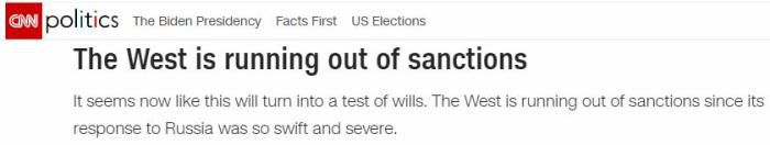 对此,美国有线电视新闻网(CNN)评论道,西方对俄制裁手段可以说“快用尽了”,接下来,将是一场对意志的考验。