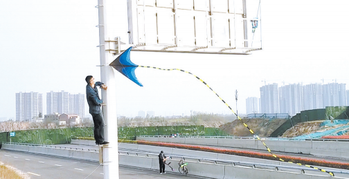 就在记者探访期间,一名男子放风筝时,不慎将风筝线挂到了道路旁的路牌上(如下图),多方想办法无果后,男子只好爬上线杆最终才把风筝取下来。“风筝线的材质多为凯夫拉线和特多伦线,很结实,不容易断。”一名售卖风筝的商贩介绍,不过,它可以承受多达100公斤的拉力,因此,紧绷的风筝线就像一把锯子,加上风的因素,有时候危险难以控制。