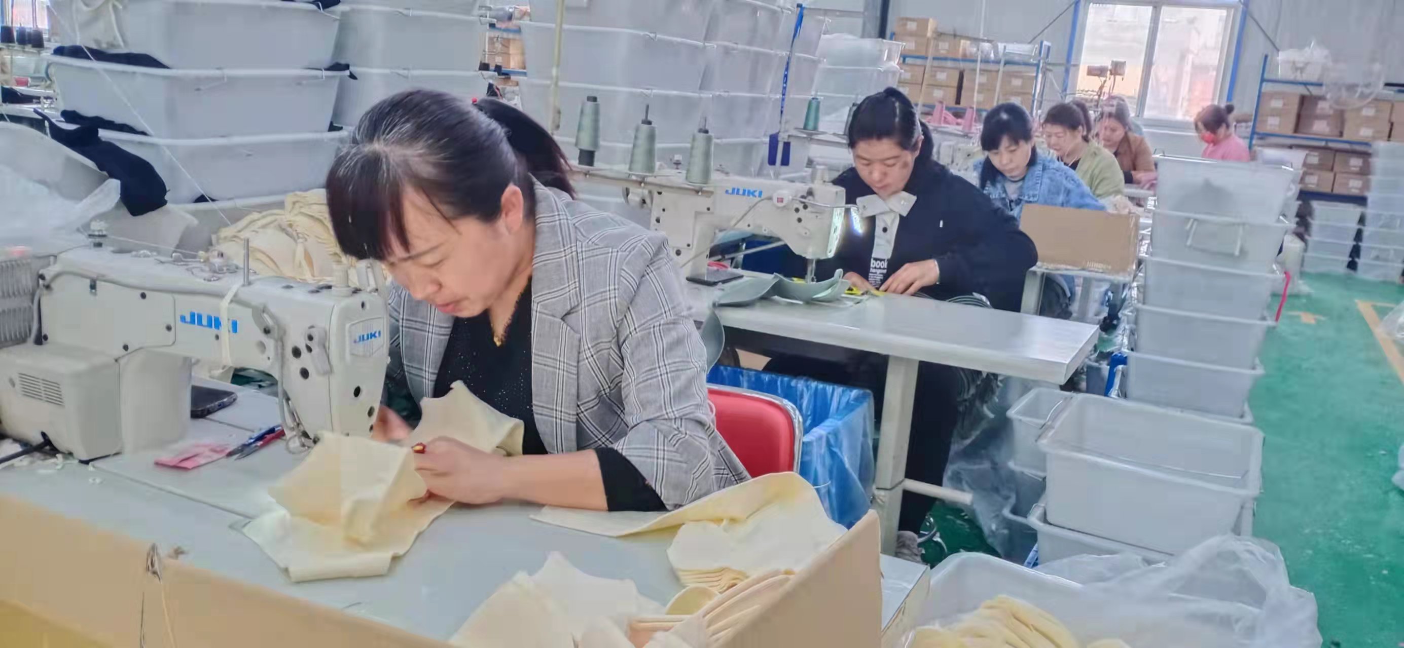 回到老家的王园园扩大了生产规模,目前厂里有工人60 多名,其中脱贫人员10名;另外服装厂还在附近的官店、马塘庄以及张良镇、马楼乡设有一些服装代加工点。“厂里给加工点提供设备和原材料,回收成品内衣。这几年平均一年能生产120万件内衣,产值在400多万元吧。”王园园说。