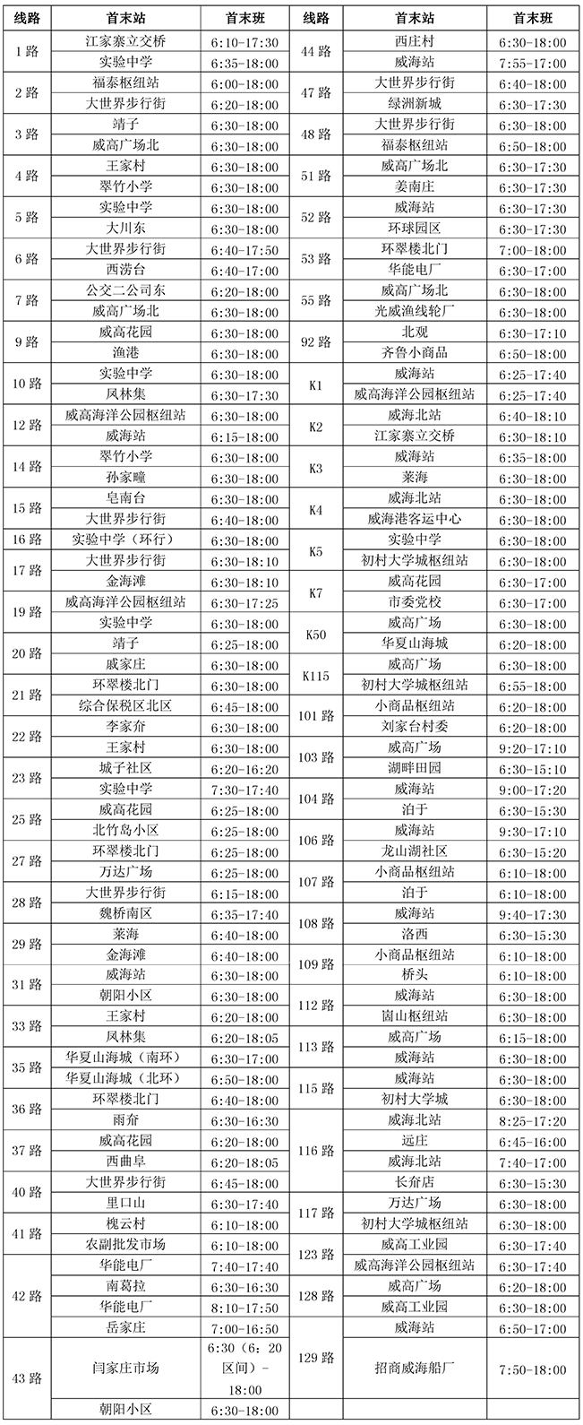 K1、K2、K3、K4、K5、K7、K50、K115、1、2、3、4、5、6、7、9、10、12、14、15、16、17、19、20、21、22、23、25、27、28、29、31、33、35、36、37、40、41、42、43、44、47、48、51、52、53、55、92、101、103、104、106、107、108、109、112、113、115、116、117、123、128、129路 ,线路运行时间6:00-18:10,班次间隔时间高峰10-40分钟、平峰30-90分钟。