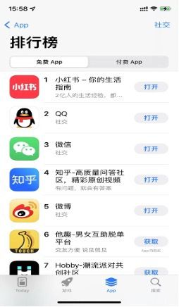 在社交赛道的细分中,老玩家们的玩法也各不一致,根据当前苹果应用商店排名,国内免费社交App前十名依次是小红书、QQ、微信、知乎、微博、他趣、Hobby、Soul、和平营地、探探。其中,主打熟人社交、陌生人社交、兴趣社交等等各有所长。