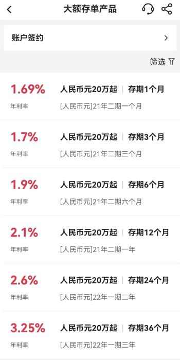 中新财经查询中行手机银行发现,起存金额2万元的3年期定期存款利率下调至3.15%;2年期定存只有50元起存一档,利率为2.25%。大额存单产品中,起存金额20万元的3年期产品利率也只有3.25%。