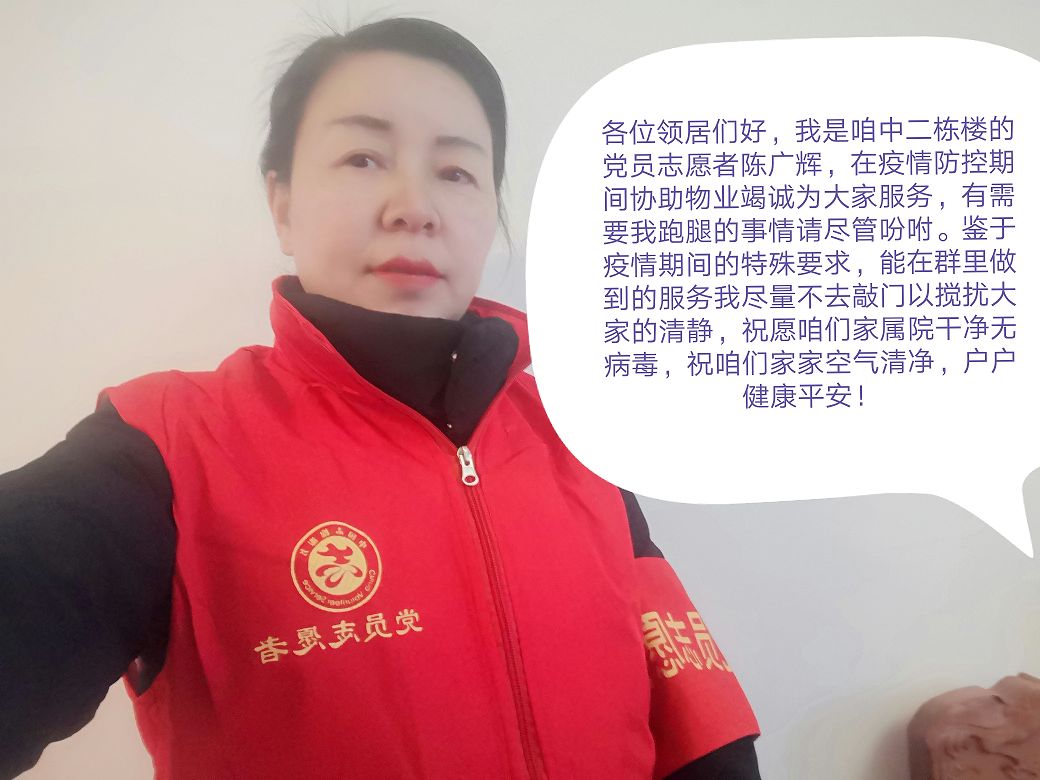 “马甲的‘红’代表着党对人民火一般的热爱,传达了党员对群众的一片赤子之心,彰显的是大爱,传递的是真情。我很荣幸这次‘抢’到了志愿服务的机会,也很开心地为邻居们做些服务工作,能为抗疫出份力我心里也很踏实。家人很支持。”陈广辉说。
