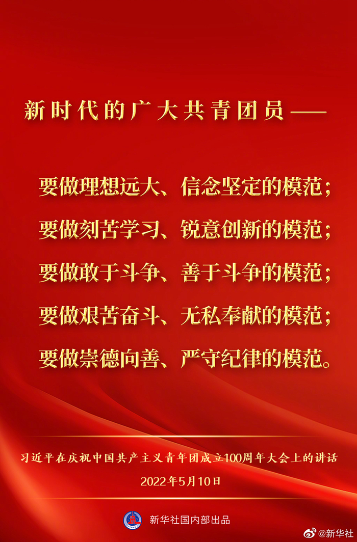习近平:新时代的广大共青团员,要做理想远大、信念坚定的模范;要做刻苦学习、锐意创新的模范;要做敢于斗争、善于斗争的模范;要做艰苦奋斗、无私奉献的模范;要做崇德向善、严守纪律的模范