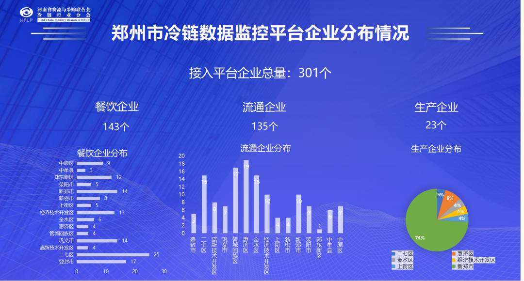 报告显示,2022年4月,郑州市冷链数据监控平台监管到的301家企业主要分为餐饮、流通和生产三大类,实现了针对冷链食品“从生产间到餐桌上”的全链条监控。其中,餐饮企业有143家,二七区分布最多,为25家;流通企业135家,惠济区共有19家,排名第一;生产企业23家,绝大多数分布在新郑市。