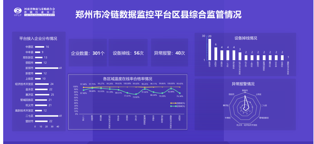 【大河报·大河财立方】(记者 丁洋涛)4月份,郑州市冷链食品行业运营情况到底如何?5月12日晚,河南省物流与采购联合会冷链分会(以下简称协会)联合易流科技发布全国首份区域性冷链行业大数据监管报告(以下简称报告)。报告显示,4月郑州市共632个冷藏/冻库在郑州市冷链数据监控平台接受监管,实现了针对冷链食品“从生产间到餐桌上”的全链条监控,其中,惠济区分布有3个大型冷库,排名第一;110个前置仓位于二七区,前置仓数量郑州第一。