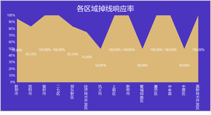 4月,郑州市各区域温度异常报警响应率为100%,所有企业对于温度异常报警都能做到积极响应。针对掉线异常,各区域响应率略有不同,除个别区域外,50%的区域能做到100%响应。