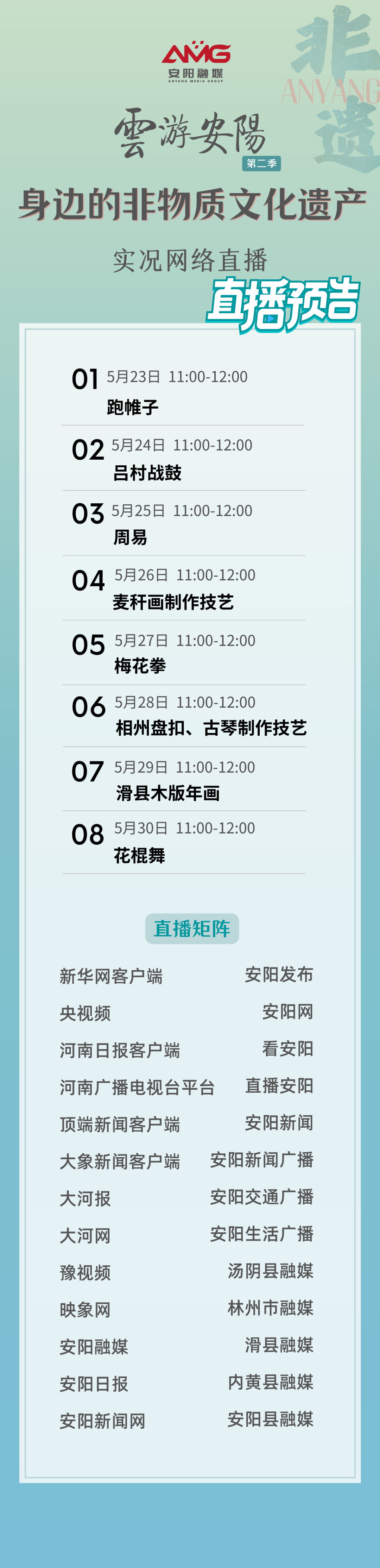本次实况直播活动从5月23日到30日,分8期进行,届时将有非遗文化传承人带您“云游”跑帷子、吕村战鼓、周易、殷都区麦秆画制作技艺、梅花拳、相州盘扣和古琴制作技艺、滑县木版年画、花棍舞等非遗项目,了解安阳传统技艺。