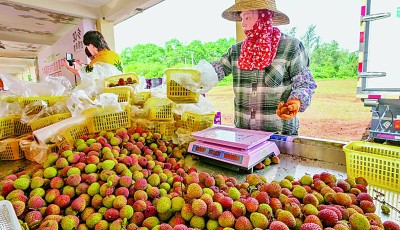 澄迈县大丰荔枝分拣基地,果农在对荔枝进行分拣包装。陈元才摄/光明图片