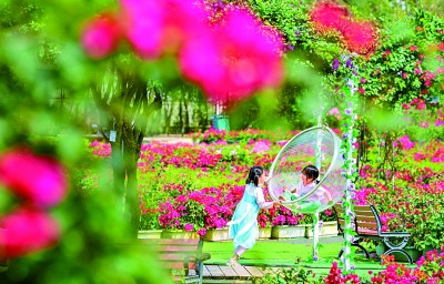 海口市琼山区红旗镇边洋村三角梅共享农庄内,两位小朋友正在玩耍。康登淋摄/光明图片