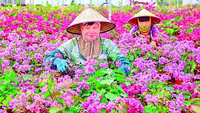 在临高县花卉产业观光园内,一簇簇三角梅生长旺盛,村民们正在修剪花枝,打理园区。陈元才摄/光明图片