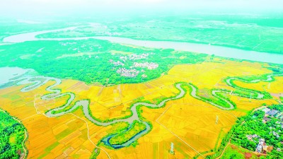 立夏时节,海口市琼山区云龙镇三十六曲溪湿地公园早稻成熟,蜿蜒曲折的河道与金黄的稻田交织成一幅美丽的图画。石中华摄/光明图片